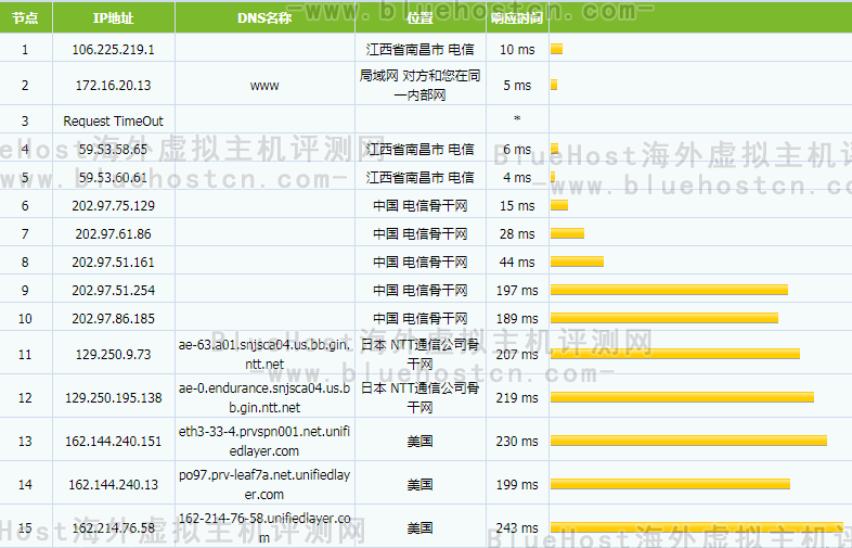 而从Tracert的测试结果来看,在国内电信走的是骨干网线路,到日本是NTT线路,然后直连美国机房,路由节点线路相对还是比较理想的。